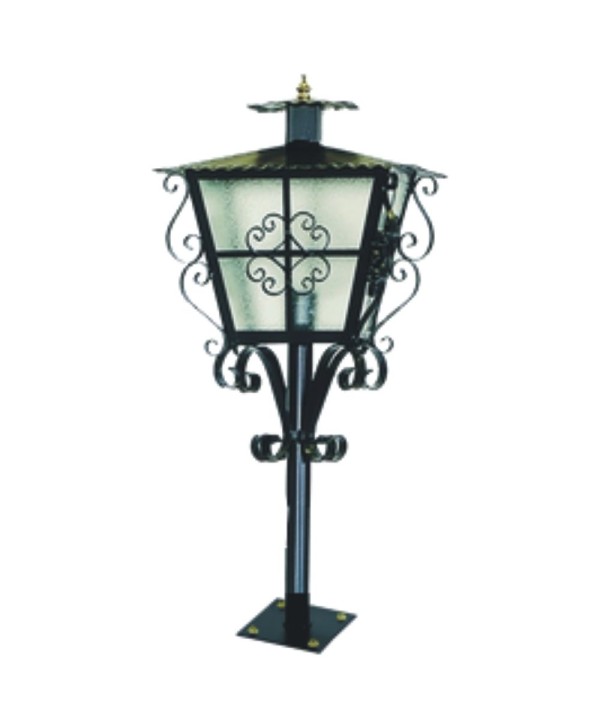 Farol de forja artística con placa para colocar en pilar o sobremuro, fabricado con rizos forjados en forma de S y C.