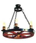 Lámpara económica y sencilla de forja artística con rueda de carro de madera en la parte central. Diseño rústico ideal para cocinas camperas, restaurantes, bares, casas y hoteles rurales...